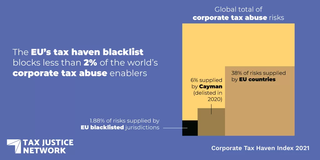 Countries on the European Union’s tax haven blacklist enable 2 per cent of global corporate tax abuse. The Netherlands, Switzerland & Luxembourg enable 15 per cent but are exempt by default.