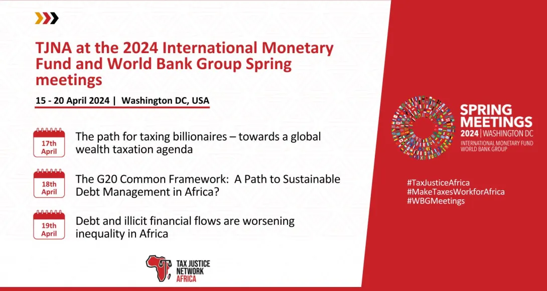 Tax Justice Network Africa will be participating in the World Bank/International Monetary Fund (IMF) Spring and Annual Meetings 2024 taking place in Washington DC, USA from April 15-20, 2024.